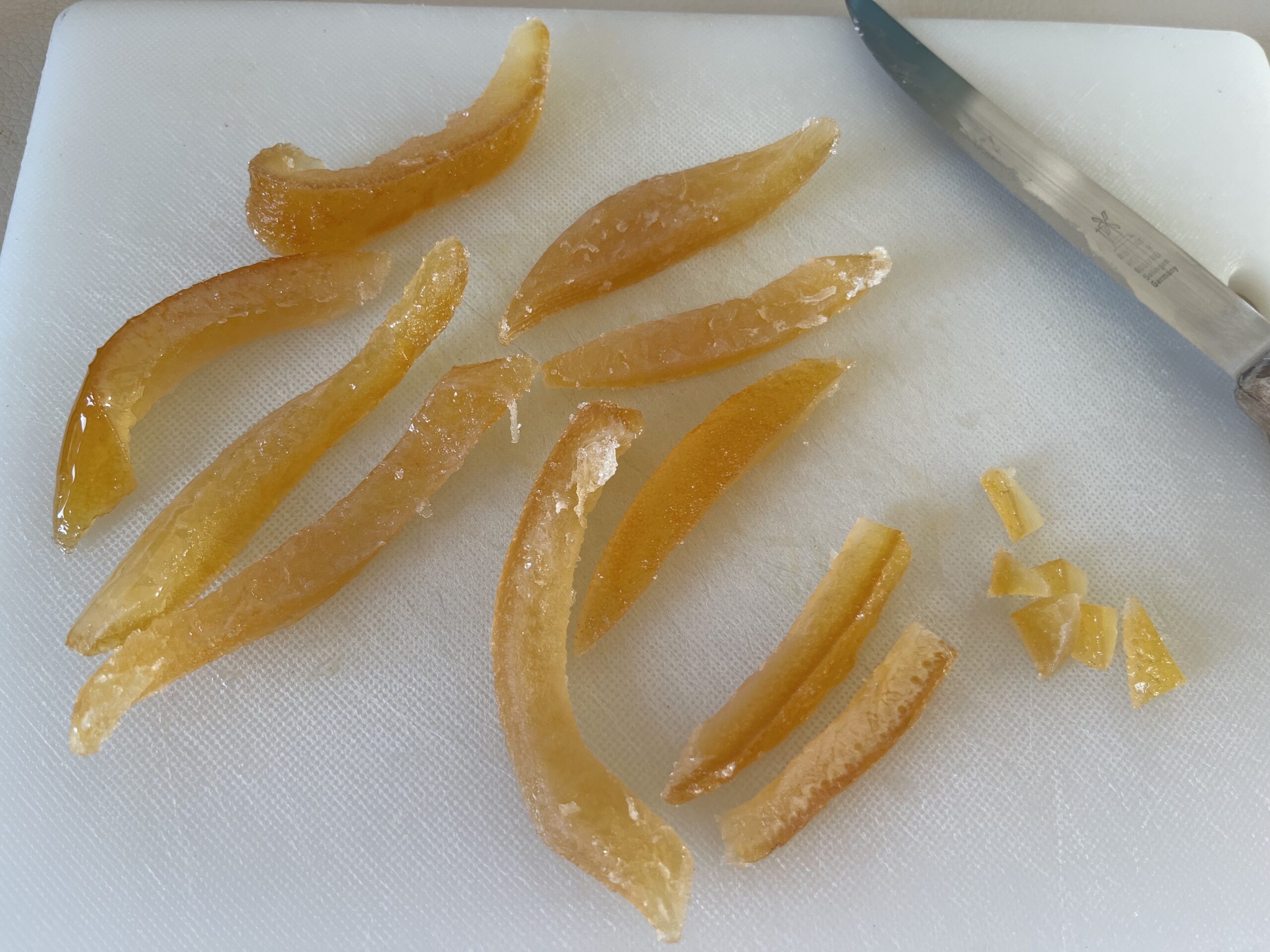• Zitronat und Orangeat in kleine Würfel schneiden (besonders gut von halbierten kandierten Früchten, im Internet erhältlich)