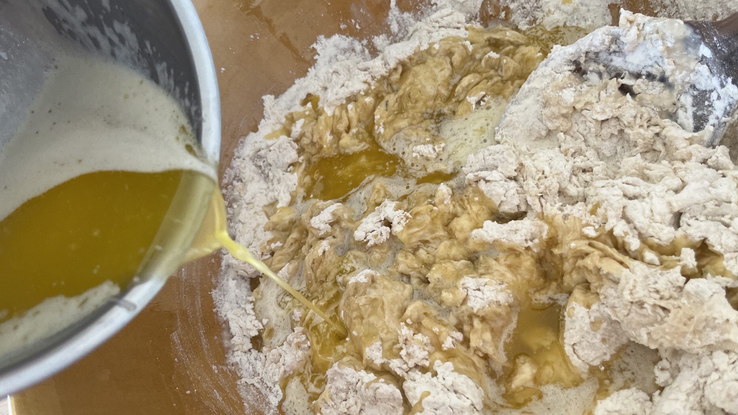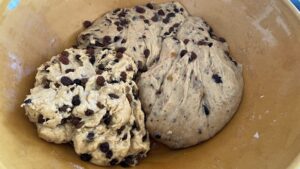 hier sieht man den Unterschied, der rechte Teil ist schon mit der               Maschine geknetet, der Linke noch nicht.