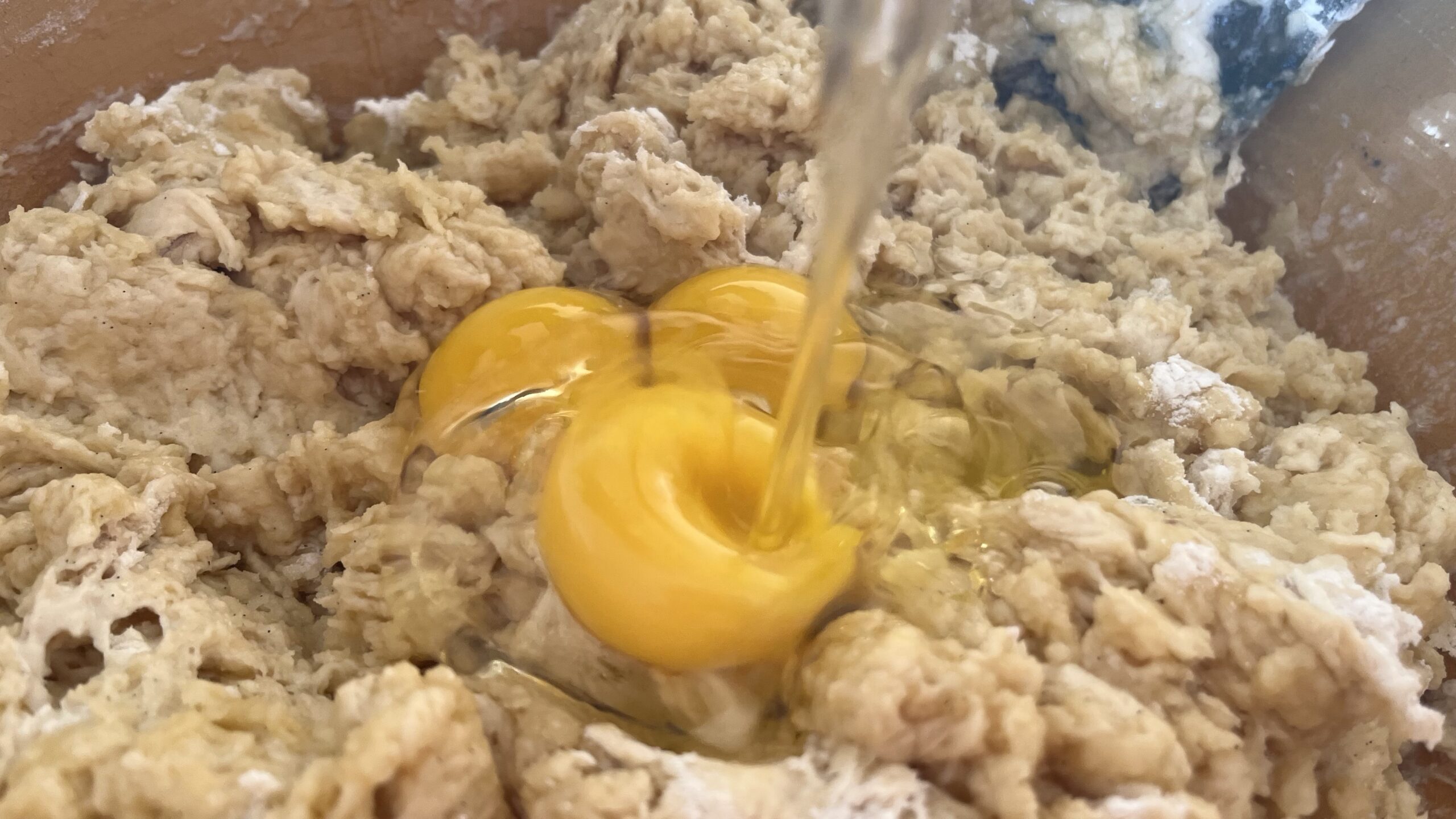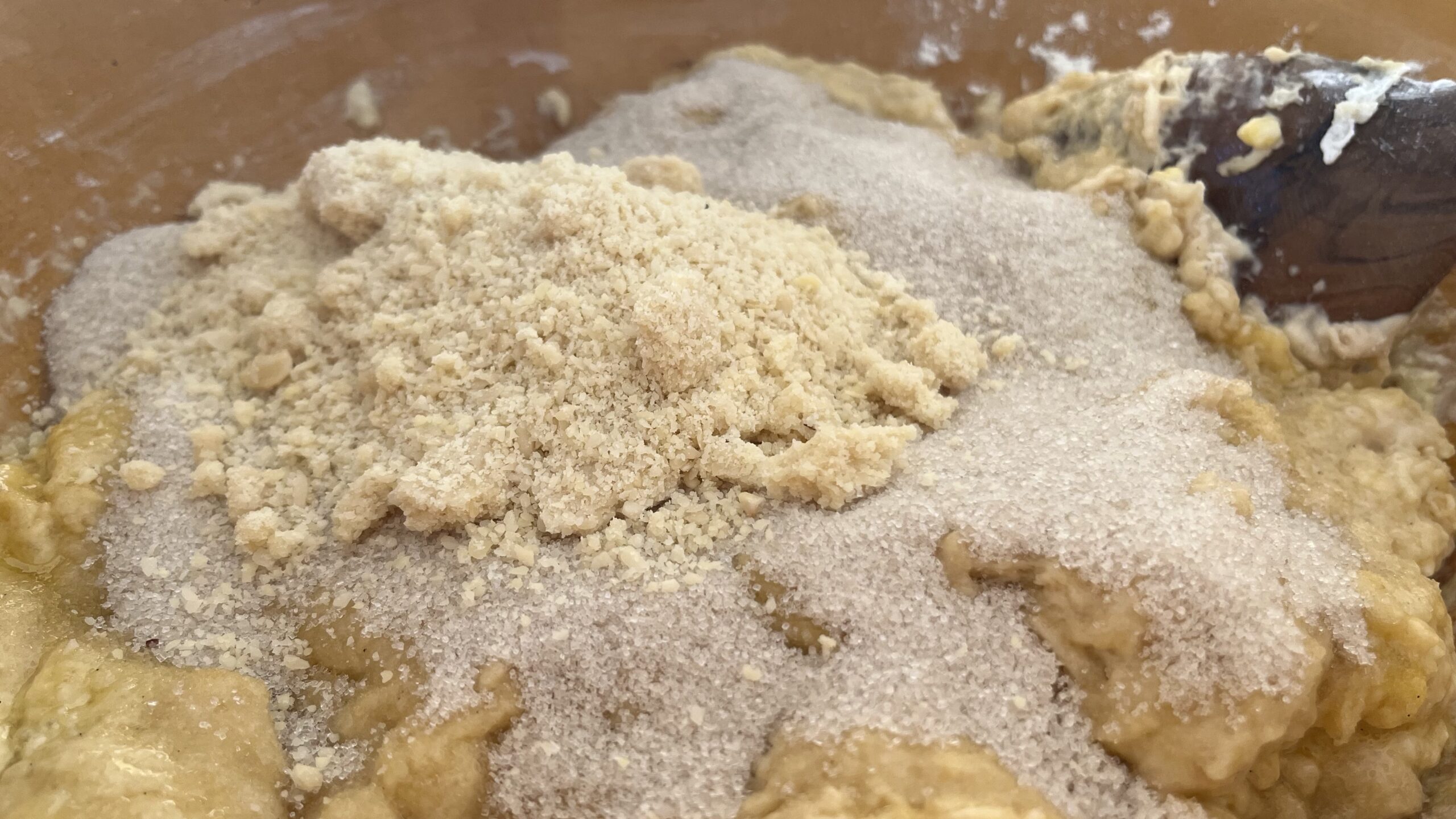 • Eier, Mandeln, Zucker und die anderen Zutaten dazugeben, mit der Hand und dann portionsweise in der Maschine gut kneten.