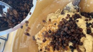 • Am Vorabend Rosinen und Korinthen waschen, trocknen und in Rum einlegen.