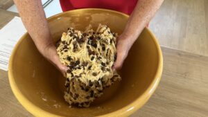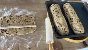 • Wenn der Teig gegangen ist, 3 Stollen formen, dabei Marzipan einlegen.