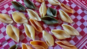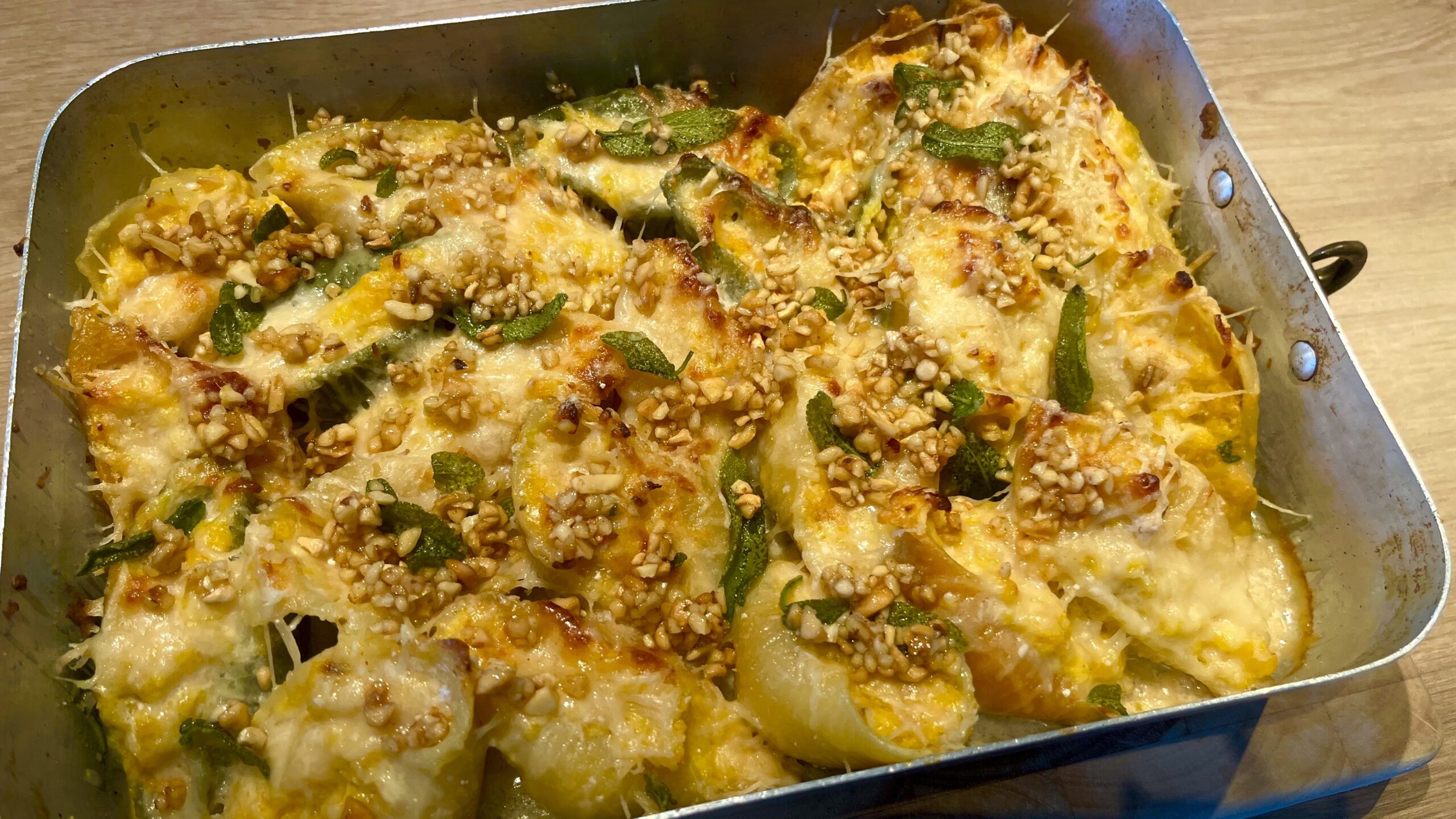 Auf meinen kulinarischen Entdeckungsreisen im Netz bin ich kürzlich auf dieses wunderbare Rezept gestoßen: mit Ricotta, Kürbis und Parmesan gefüllte Riesenmuschelnudeln, gebadet in Sahne und Noilly Prat, überbacken und gekrönt von in Butter gebratenem Salbei und Haselnüssen. Ich hatte schon beim Lesen den köstlichen Geschmack auf der Zunge und meine Erwartungen wurden voll erfüllt. Noilly Prat ist ein französischer Vermouth, der in jeder gehobenen Küche verwendet wird. Ich habe immer eine Flasche da. Man kann ihn in diesem Rezept durch Brühe mit Zitronensaft oder Weißwein ersetzen. Die Pasta, auf italienisch Conchiglioni, bekommt man zwar nicht in jedem Supermarkt, ist aber doch gut zu finden. Das Füllen der Nudeln ist etwas knifflig, ich bin früher daran verzweifelt. Das war dieses Rezept: